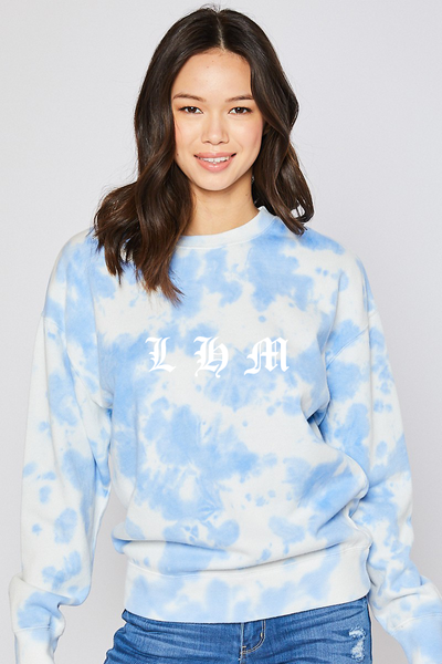 On cloud nine with this new hue! Dreamy blues hand dyed crewneck features a baby blue and white tie dye with option for initials across chest.